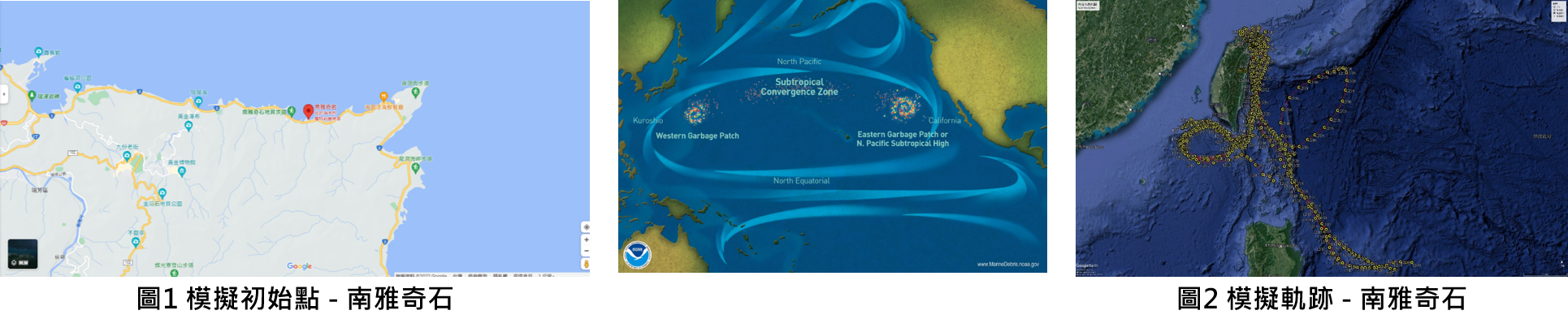 上面案例取用臺灣東北角的垃圾最終堆積處之一的「南雅奇石」進行垃圾漂流模擬,模擬的方式是使用「backward」,並參照 NOAA 提供的「太平洋垃圾帶」作為依據,進行連續 20 天的漂流軌跡模擬,而每天都模擬了回推 28 天的軌跡。根據下圖的模擬結果顯示,垃圾軌跡主要來自台灣西南部及菲律賓東北方,其中台灣西南部部分軌跡由西太平洋流進,於此處回流後往台灣東部流。